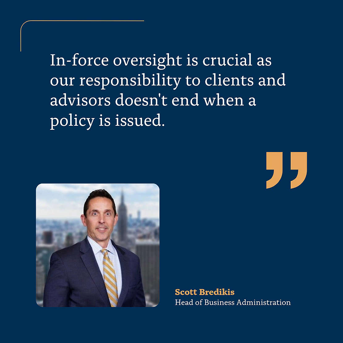 In-force oversight is crucial as our responsibility to clients and advisors doesn't end when a policy is issued. We continuously monitor our book for potential issues stemming from changing regulations, pricing shifts, or legacy contract features. Proactive outreach, client notifications, and advisor updates help us maintain transparency and reduce surprises. This vigilance protects both our brand and the advisor-client relationship.